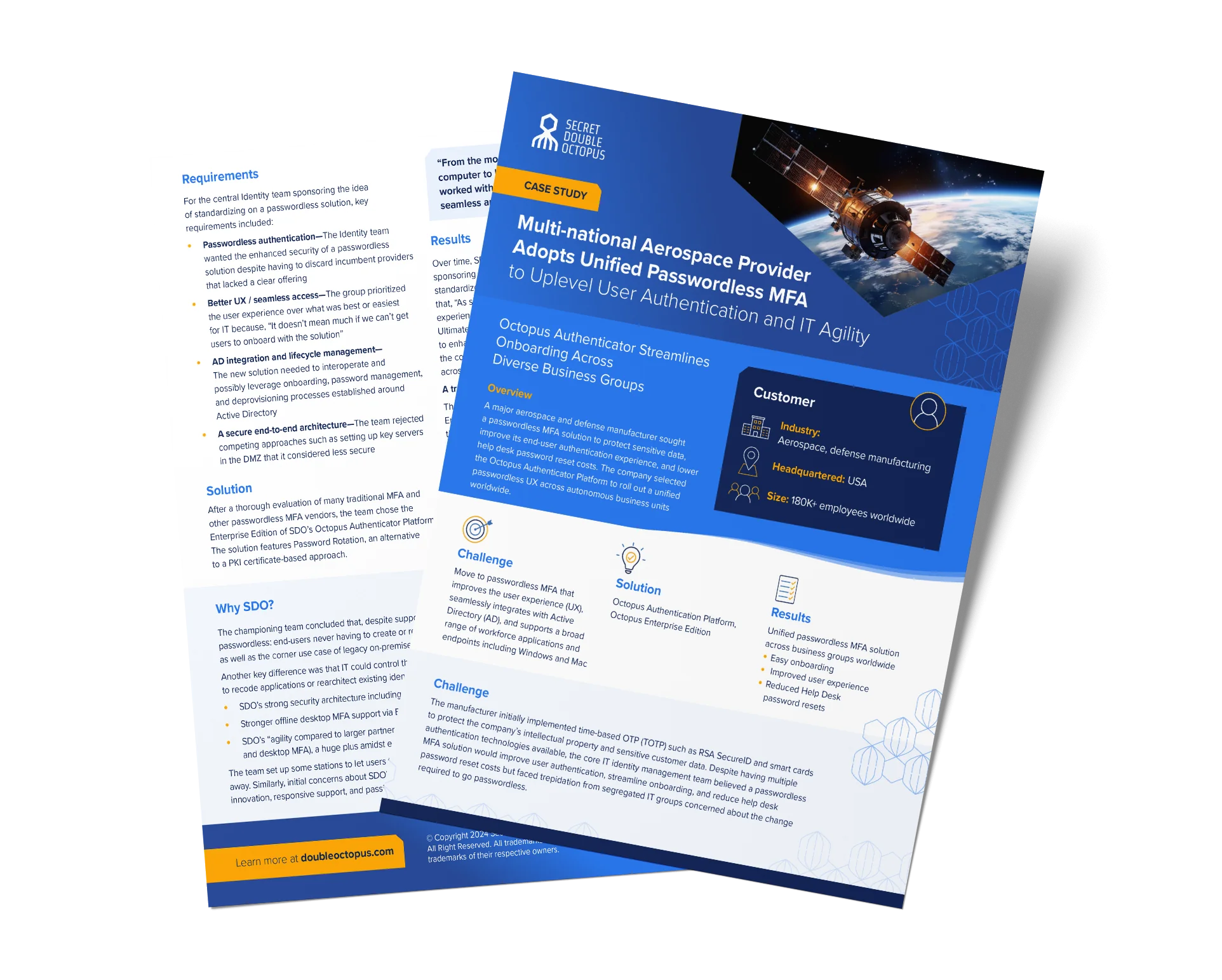 Critical businesses run on managed on-premises custom and legacy applications. Octopus passwordless MFA eliminates user password authentication without forcing IT to recode applications or rearchitect the identity infrastructure that drives your business.
